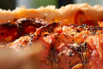 Tomaterna på toppen kommer bli aningen mörka men bli inte orolig, smaken av en rostad tomat är något av det bästa, det är så vår paj ska serveras.