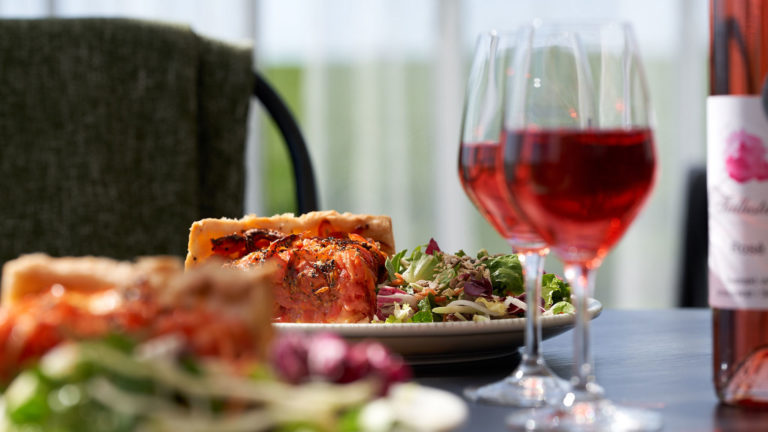 Vår omtalade och populära tomatpaj serveras med sallad, rostad salladstopping och husets egen jordgubbsvinäger.